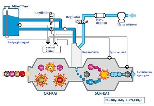 Bu madde aracılığıyla kimyasal ayrıştırma esnasında azotoksikler su buharına ve azot gazına dönüştürülerek egzosd. Akciğer iltihabı ve ciddi solunum problemleriyle ilişkilendirilen bu gazlar asit yağmurlarına ve yoğun hava kirliliğine sebep olur. Bu sırada dağ başında iseniz çekici çağırmak zorunda kalabilirsiniz.