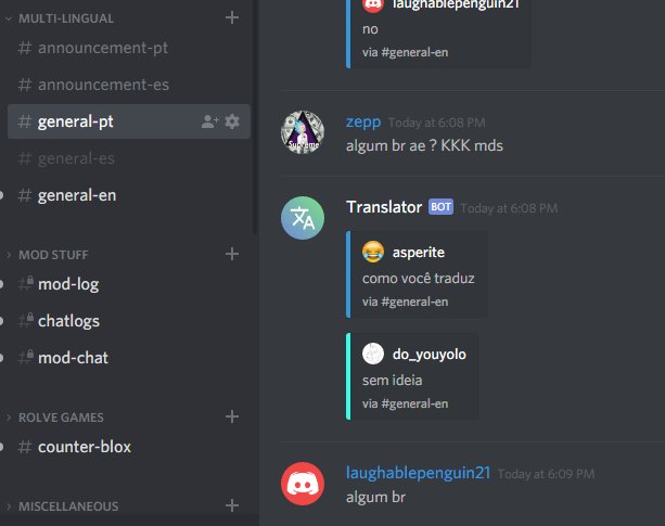 Discord translate bot. T ping pings the client. I m a discord bot that can translate all what you say with 100 languages available. Visit my website to see fully how to use commands. Now i can not translate more than 20 words but maybe soon can permit more than this.