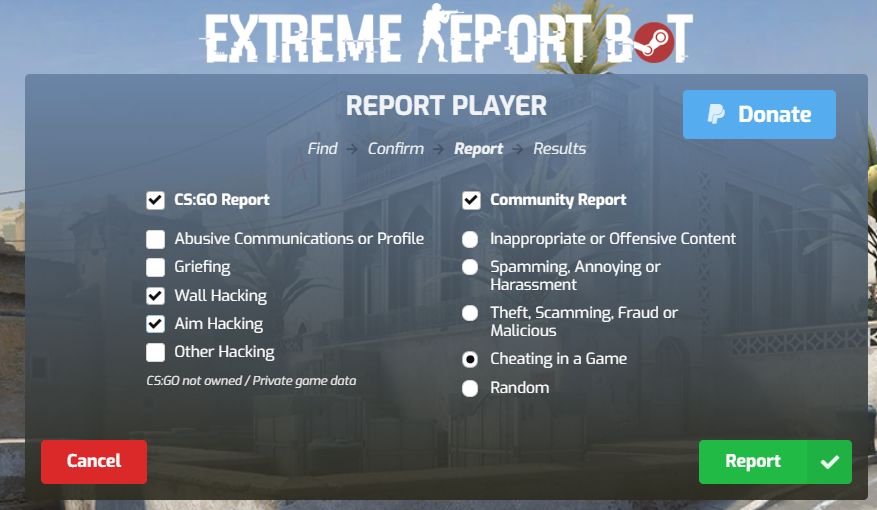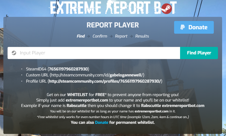A bot used to manage reports in a user friendly embed no need for a silly template that users don t actually use when typing out their reports. I v been game banned because of this. Global offensive general discussions topic details. Report the player with the steamid xy.