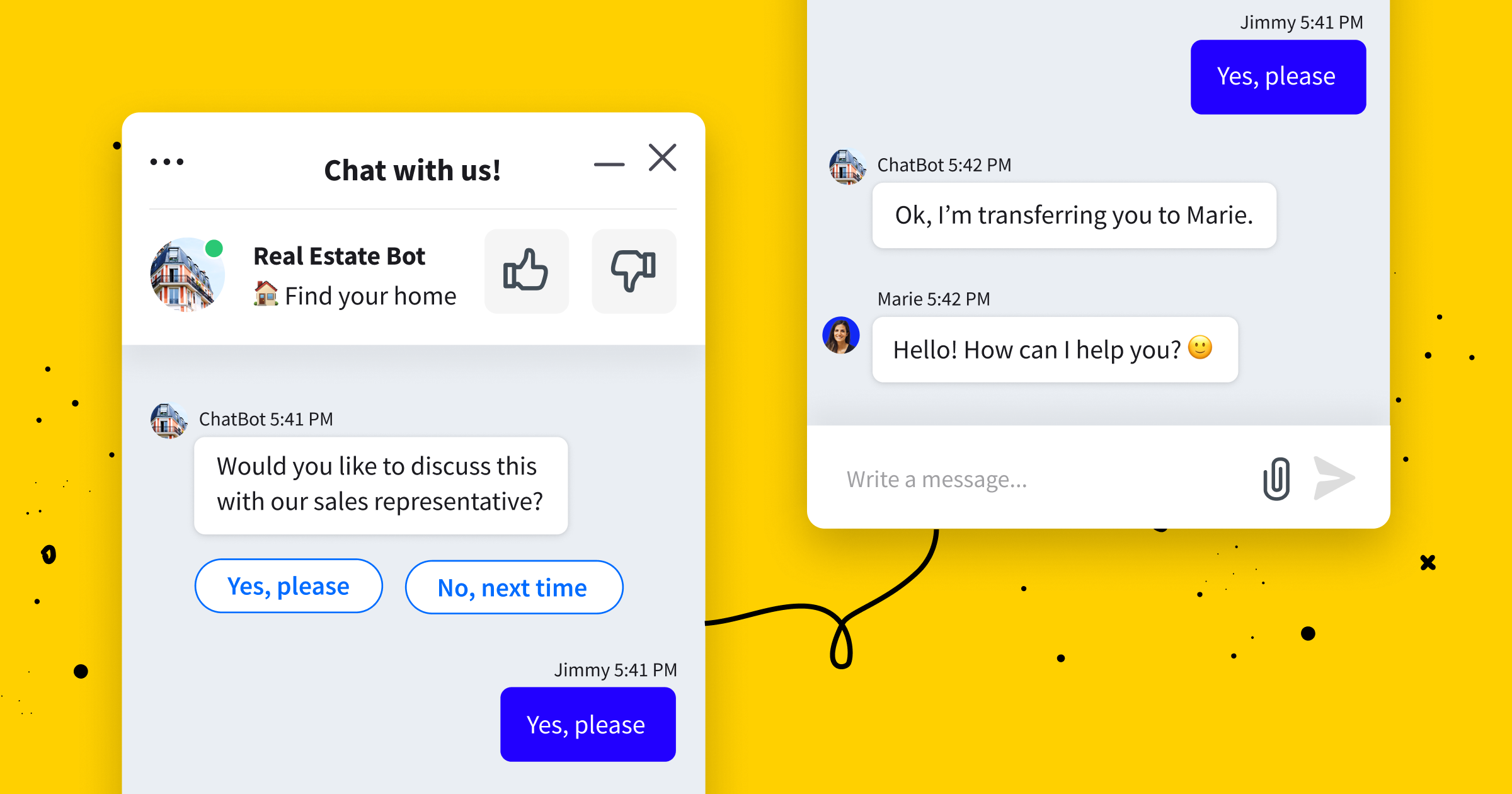 At any rate chatbots aren t here to completely replace humans in customer service not for the moment at least but rather to act as a tool to help us save money time and energy. Live takeover or chatbot to live agent transfer is a process where a customer is talking to a bot and at some point in the conversation a live agent aka real human jumps in and takes over the conversation. Transfer when the human touch is required chatbot will seamlessly assign the issue to a live agent.