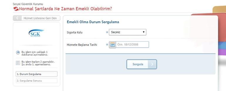 İşleme başlamak için öncelikle bu bölümün en altındaki bağlantıya tıklayıp e devlet sistemindeki emekli olma tarihini sorgulama sayfasını açın. Ne zaman emekli olurum hizmeti e devlet sayfasında bulunuyor. Kriterlere göre ne zaman emekli olacaklarını hesaplar.