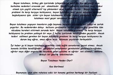 Boyun tutulması boyun kaslarının sertleşmesinden kaynaklanan bir durumdur. Kişide sürekli boyun ağrısı baş ağrısı hareket kısıtlılığı gibi semptomlar uzun süredir vardır. Burada bu sağlık sorunu hakkında bilgilendirici açıklamalar bulacaksınız.
